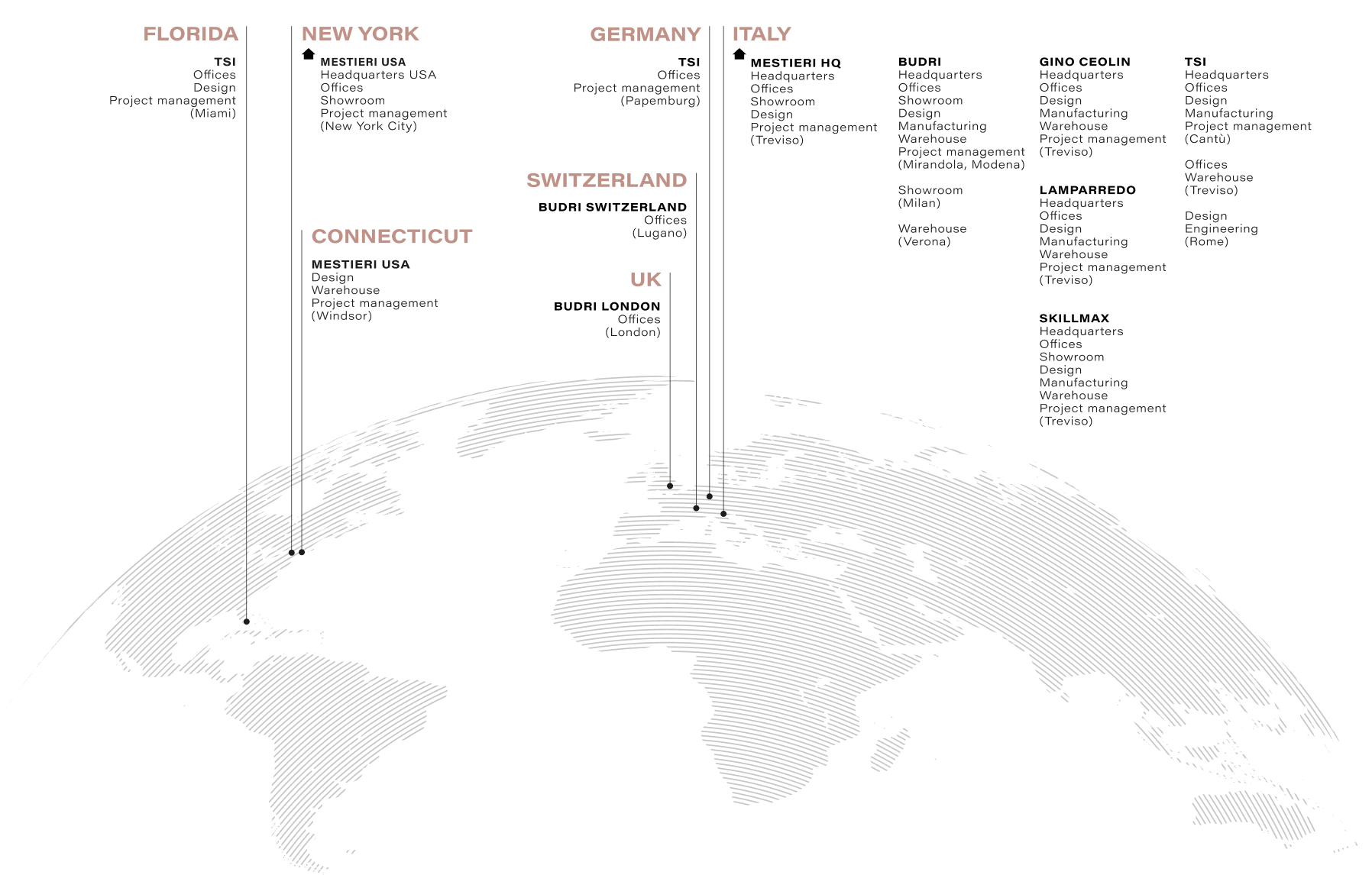 Il partner strategico e operativo per la comunità creativa (architetti, interior designer, clienti, brand, ecc.) nello sviluppo e nell'ingegnerizzazione delle loro idee e dei loro sogni in progetti su misura esclusivi. Mestieri è il punto di riferimento per le sinergie progettuali e realizzative delle varie aziende del segmento, supervisiona l'intera catena di produzione interna e si occupa della gestione tecnica, organizzativa e normativa dei più complessi progetti multidisciplinari.